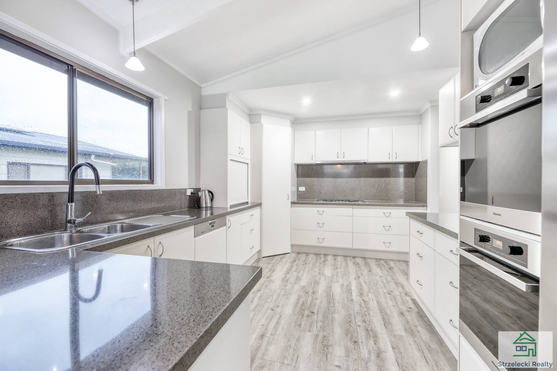 Modern kitchen featuring ceaser stone benchtops, quality Miele appliances, double oven, gas cooktop, dishwasher and a large fridge alcove. This well presented home also has a brand new tastefully renovated bathroom. Quality fixtures and fittings are a standout in this home.