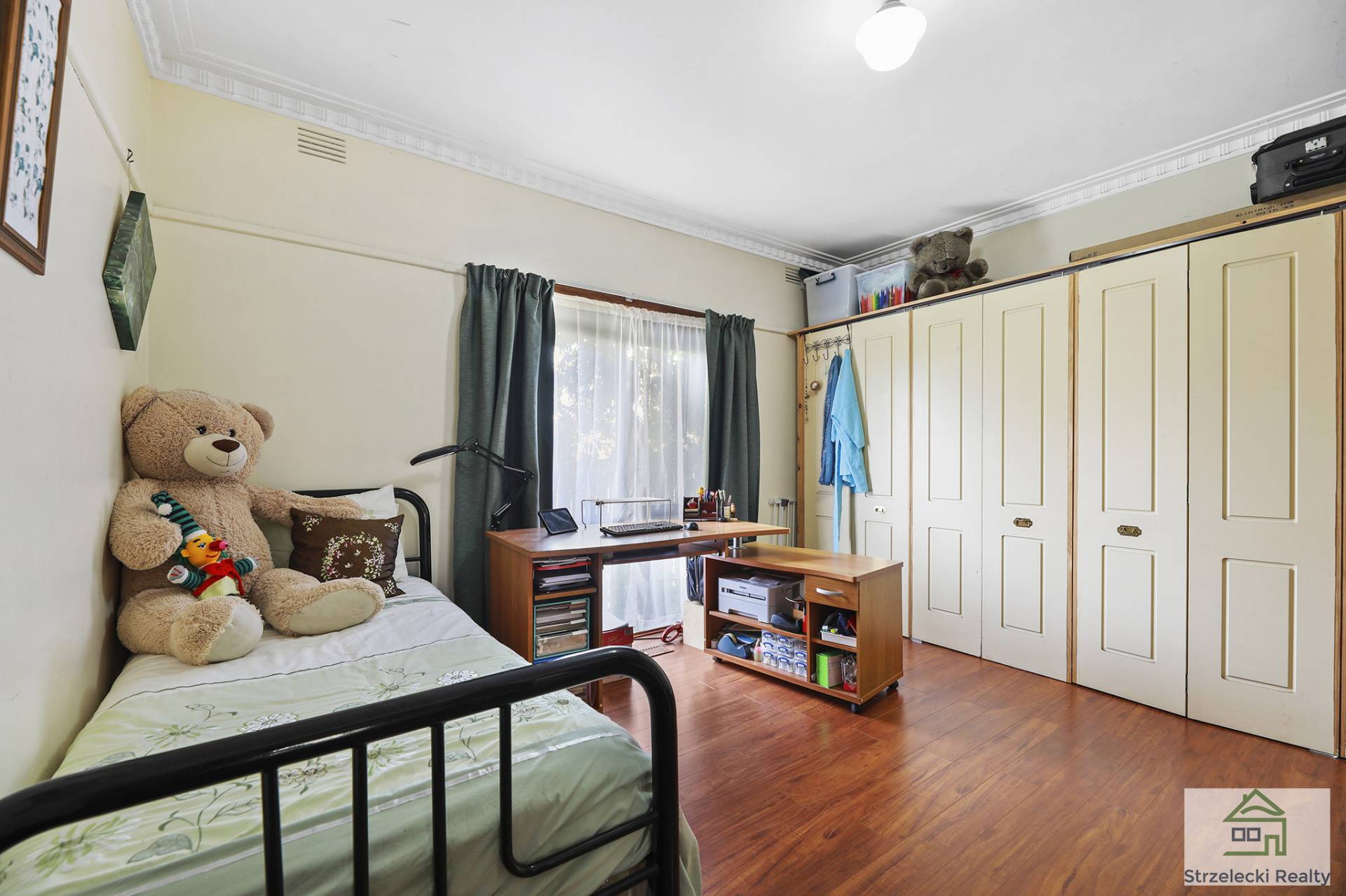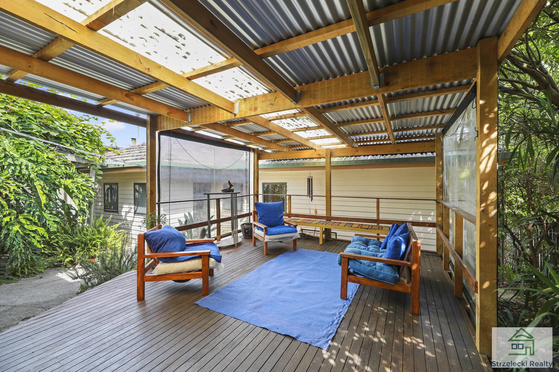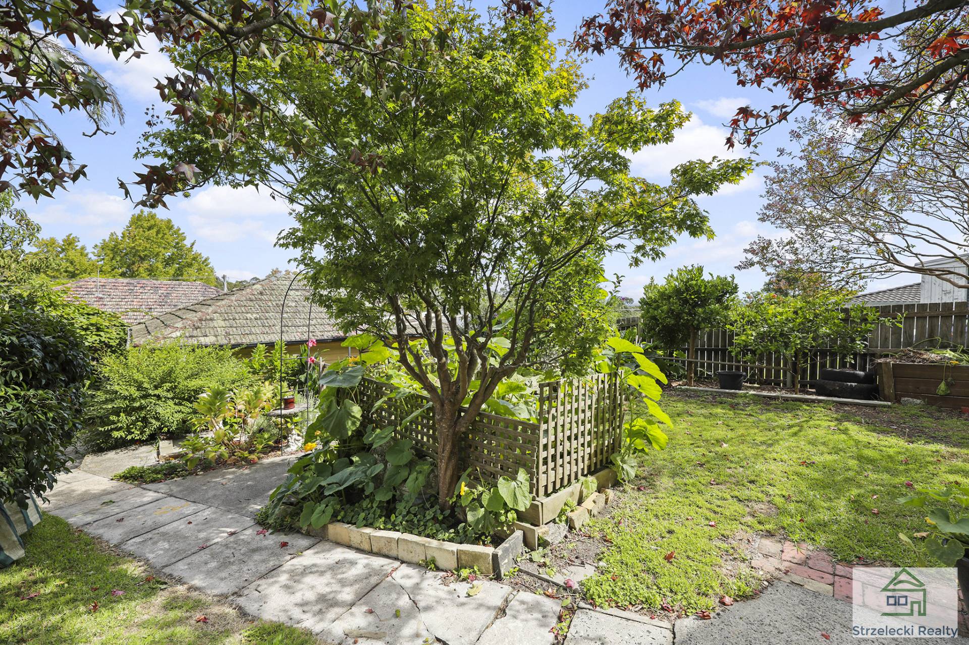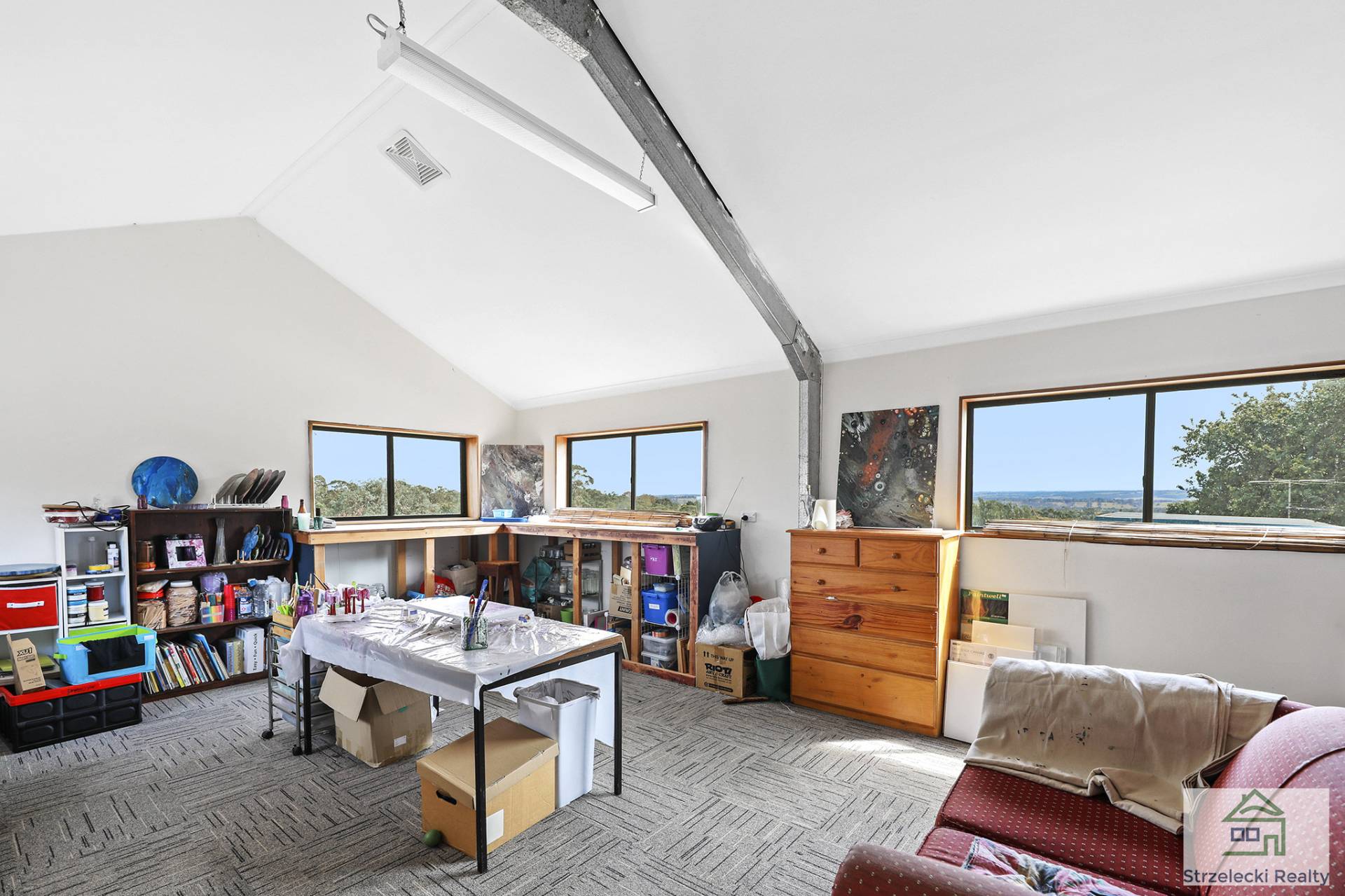 The rear of the block hosts a double storey studio and workshop, with spectacular views of the Baw Baw Mountains and a deck wrapped around one side. Rear access to studio and back of yard via a laneway, with large shedding and double carport. Enjoy a soothing cuppa in the leafy garden with fruit trees, vines, chook sheds and veggie gardens.