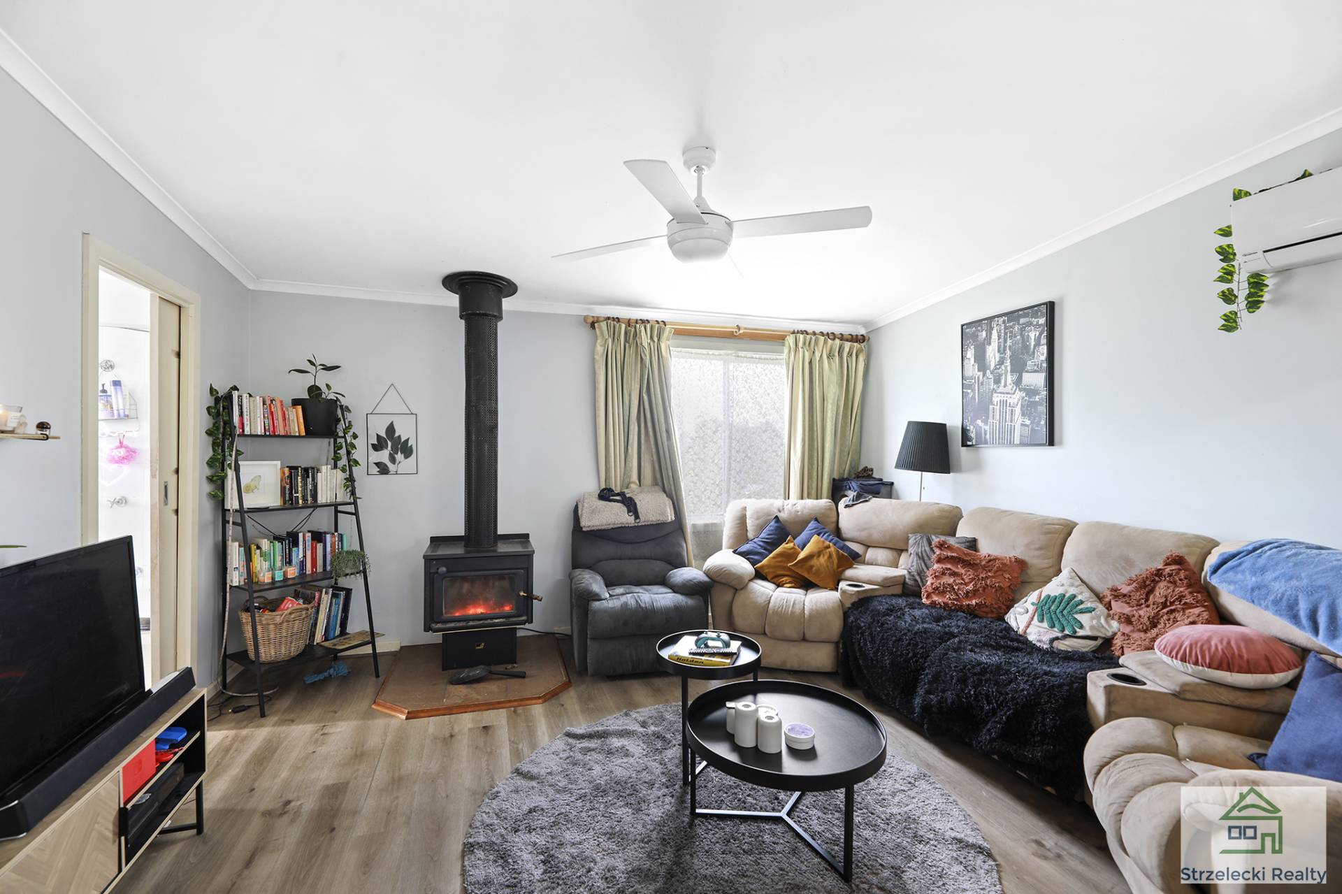 • Lounge with wood heater, split system & ceiling fan
