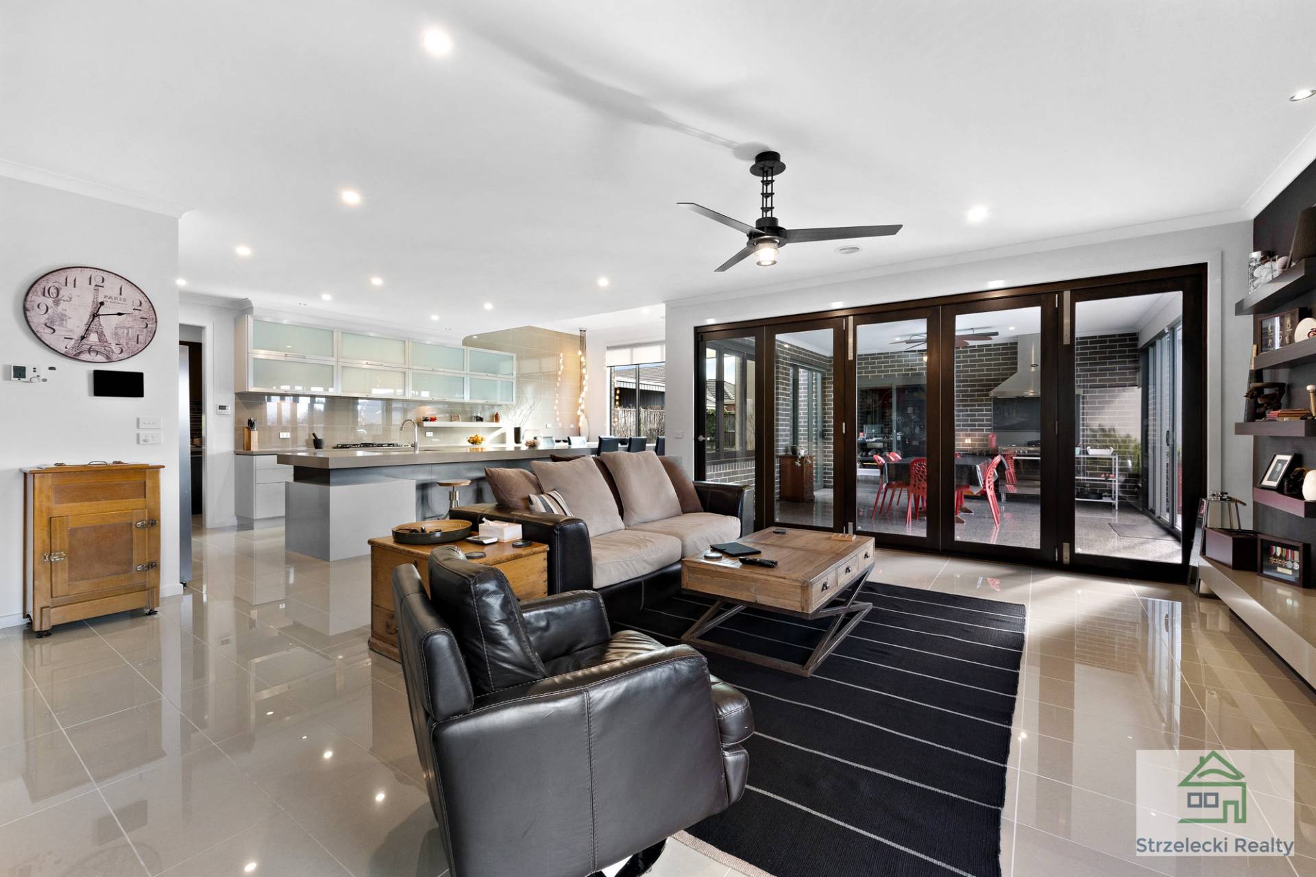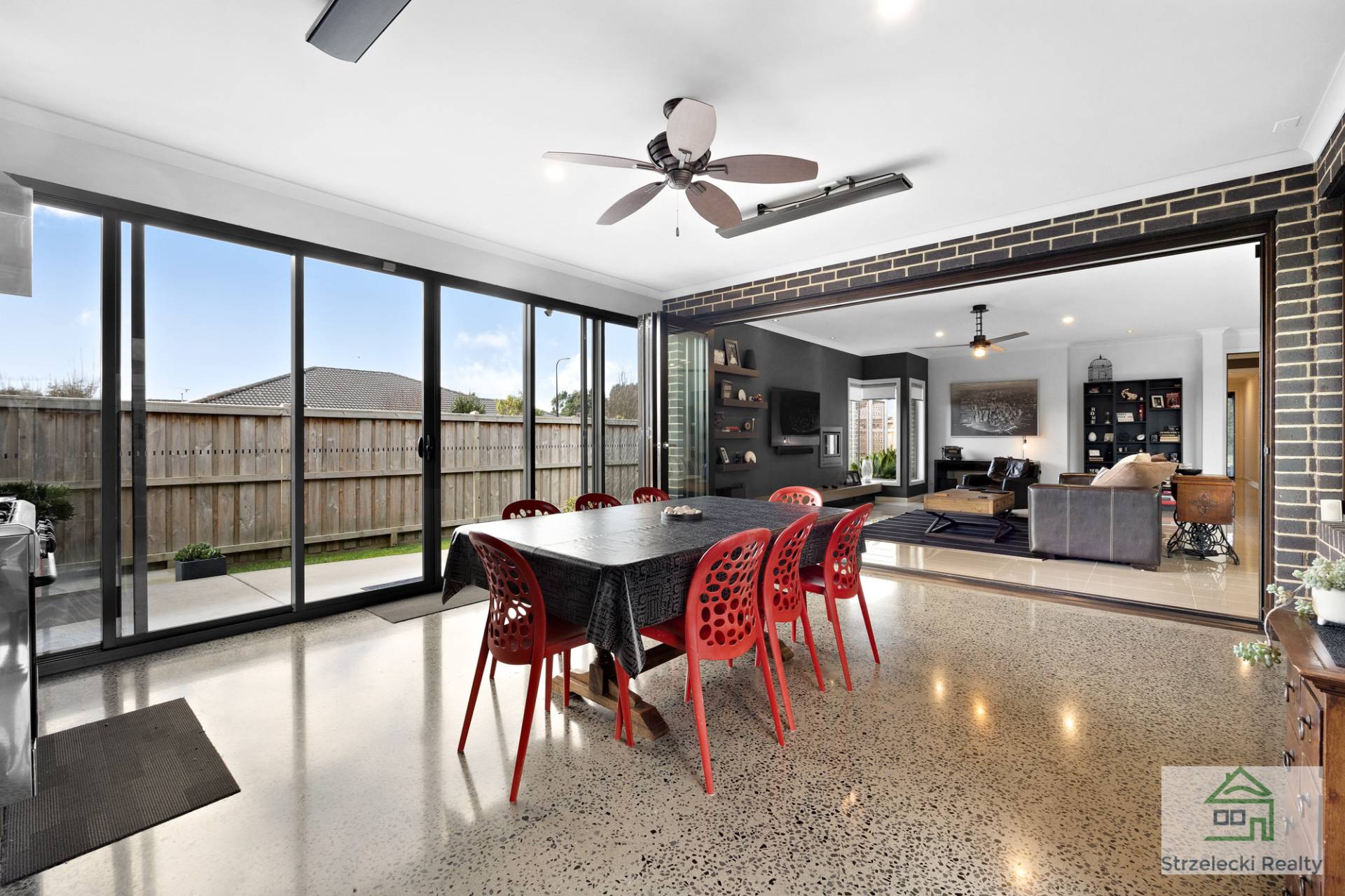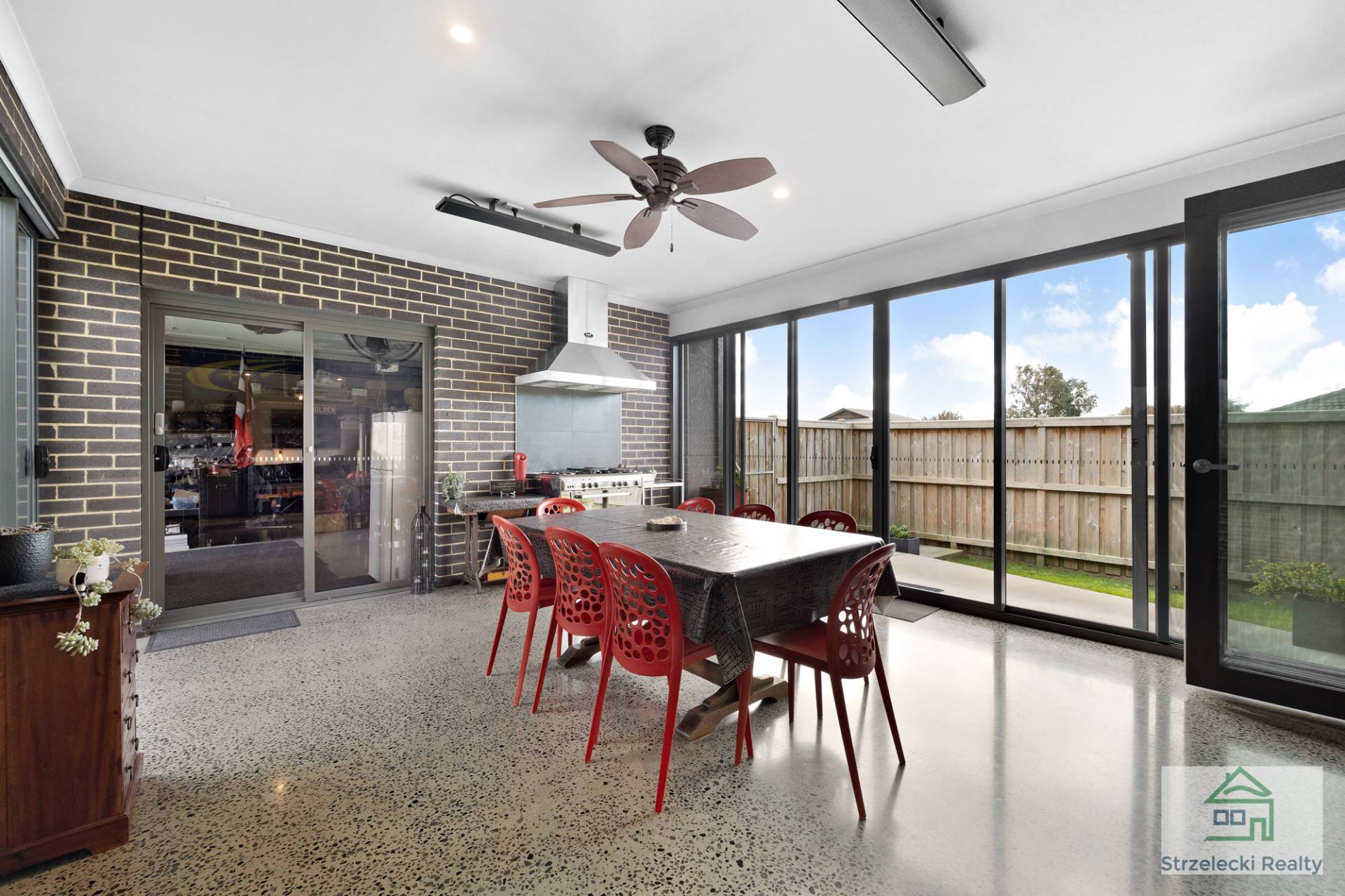 Large stacker doors open to the outdoor living area, creating a seamless fusion between indoor and outdoor entertaining. The stylish polished concrete flooring and a large cooker with range hood and overhead fan heating or cooling add to the appeal of this captivating space.