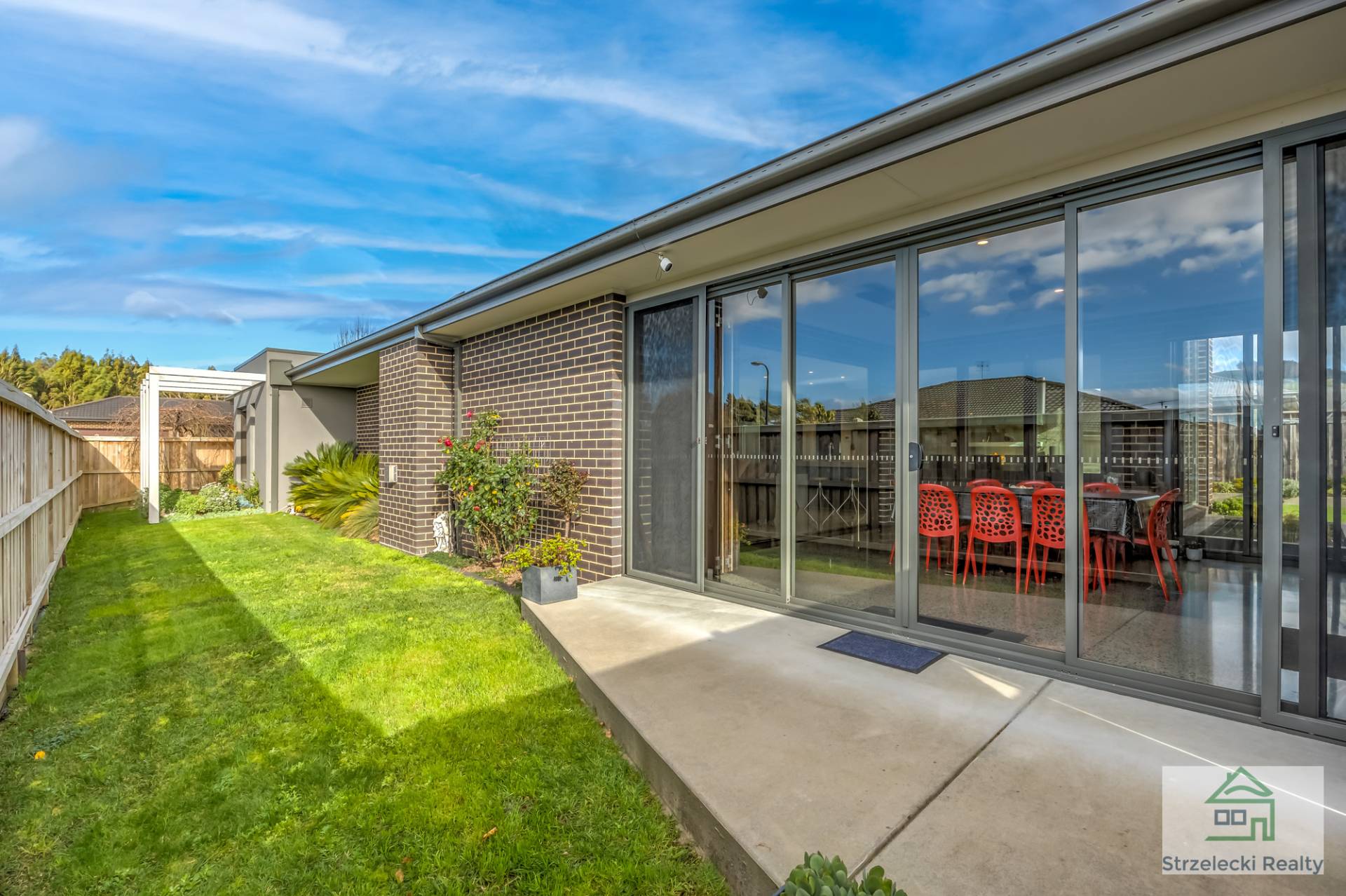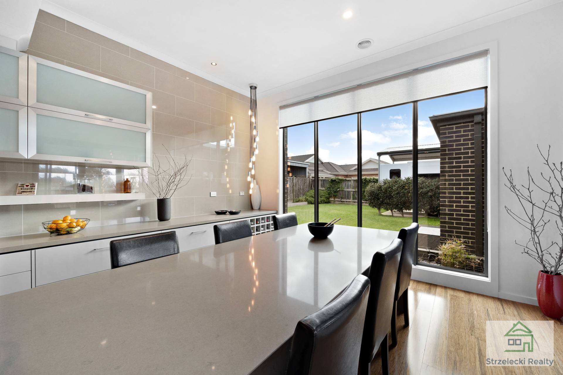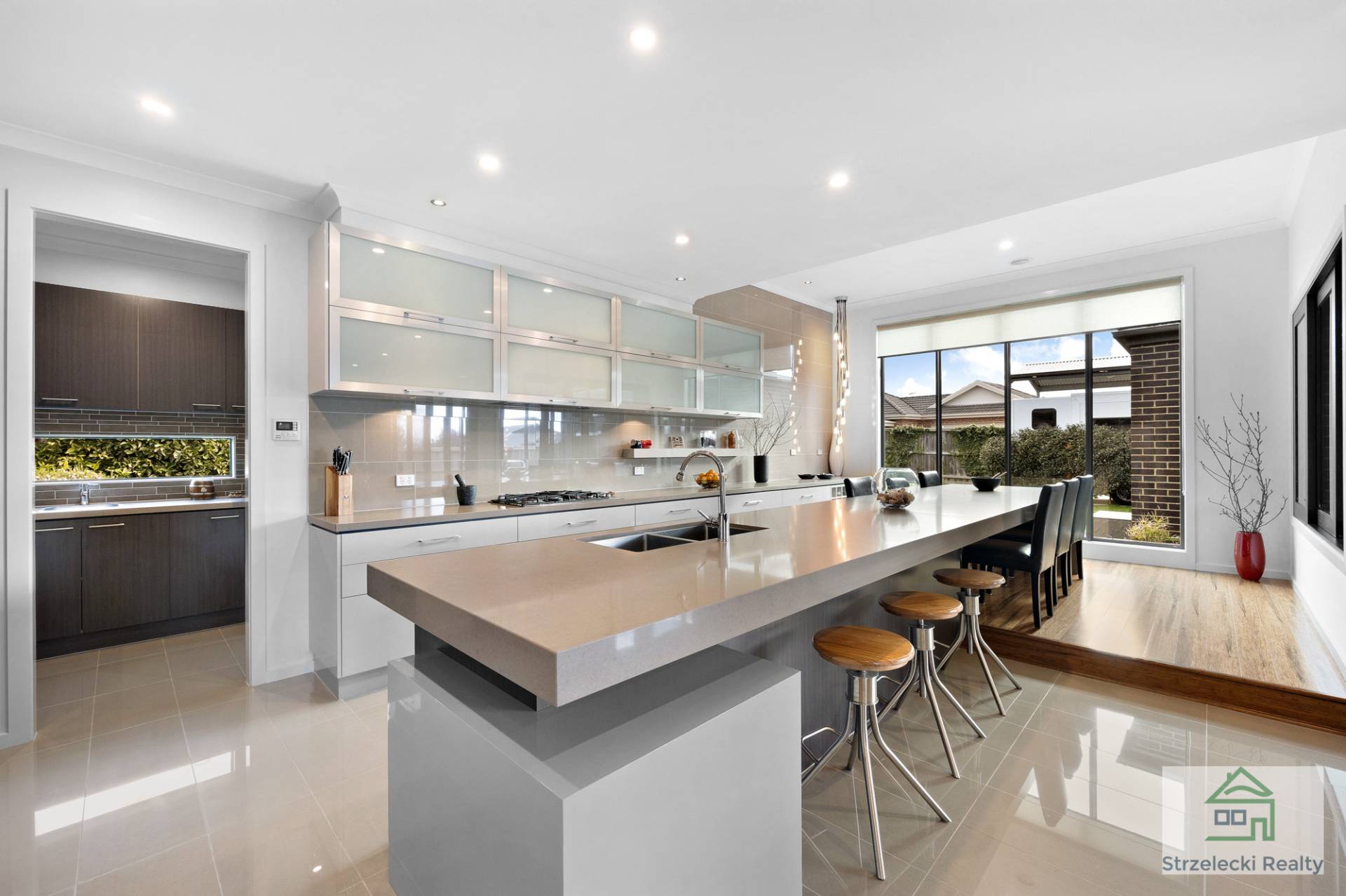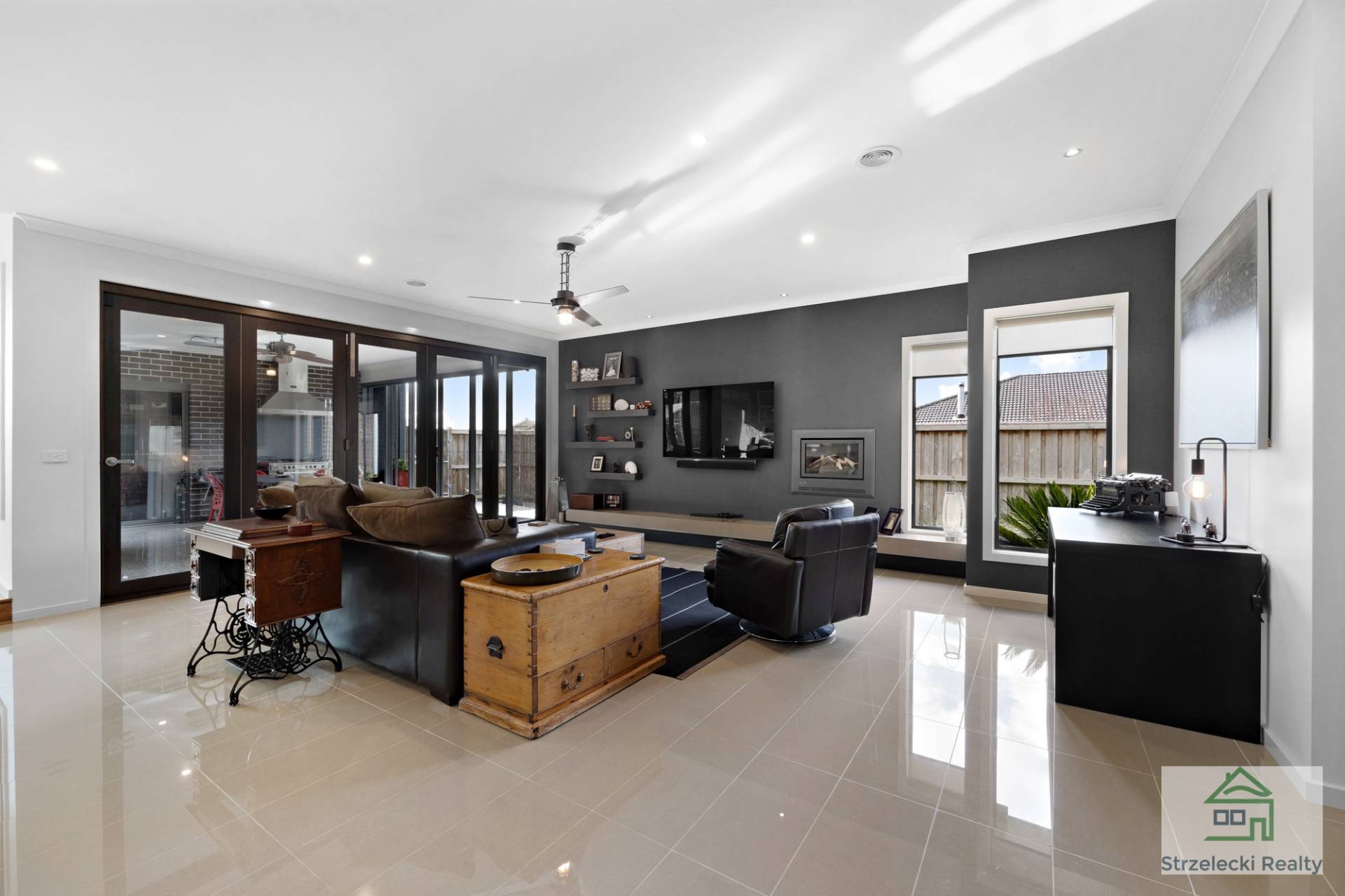 Large stacker doors open to the outdoor living area, creating a seamless fusion between indoor and outdoor entertaining. The stylish polished concrete flooring and a large cooker with range hood and overhead fan heating or cooling add to the appeal of this captivating space.