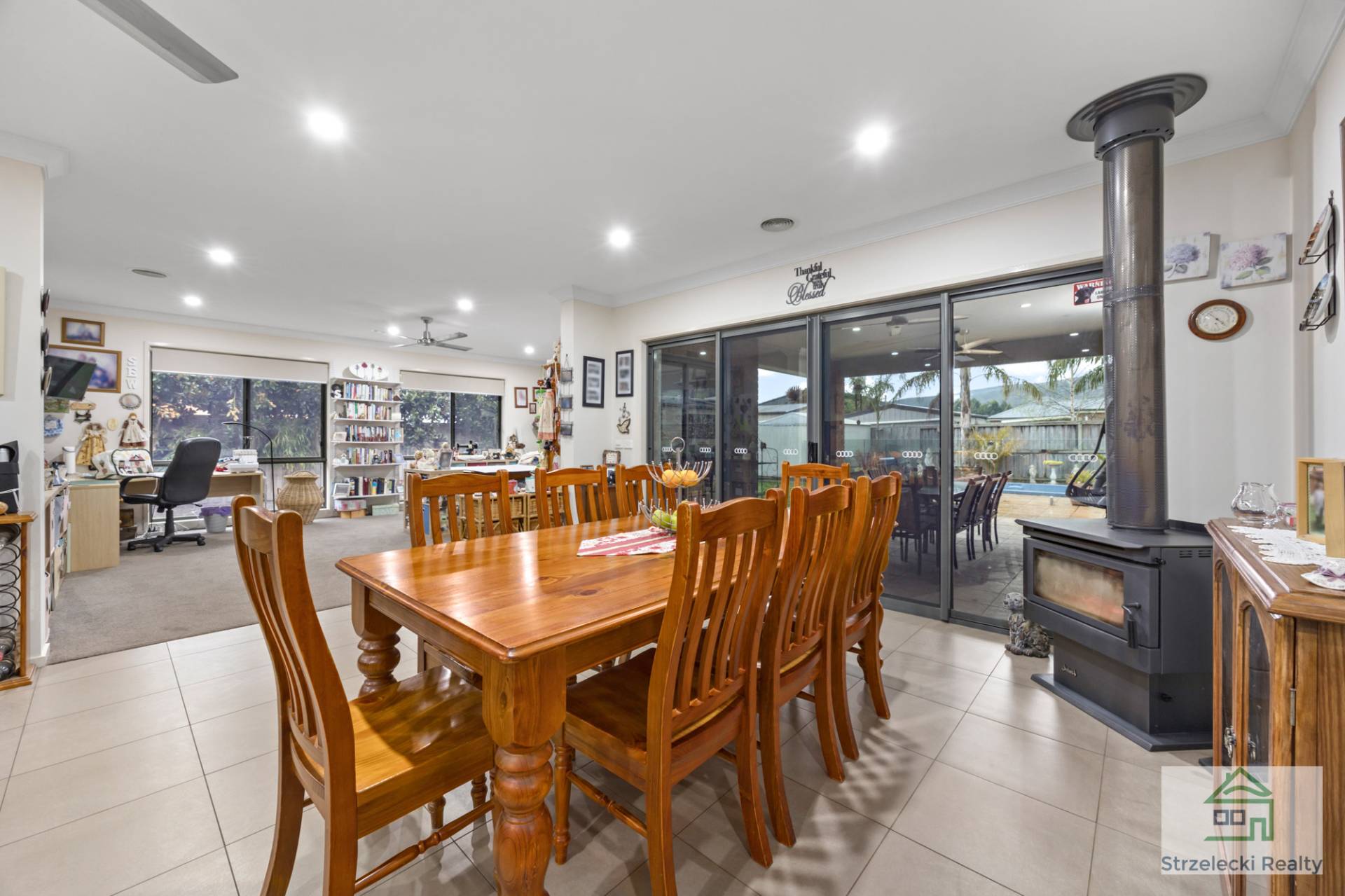 The open plan kitchen/dining/living is the main hub/gathering area and features Caesar stone bench tops, gas cook top with electric oven, WI pantry, dishwasher, ample cupboard space and a slow combustion fireplace letting you enjoy the ambience of indoor heating.