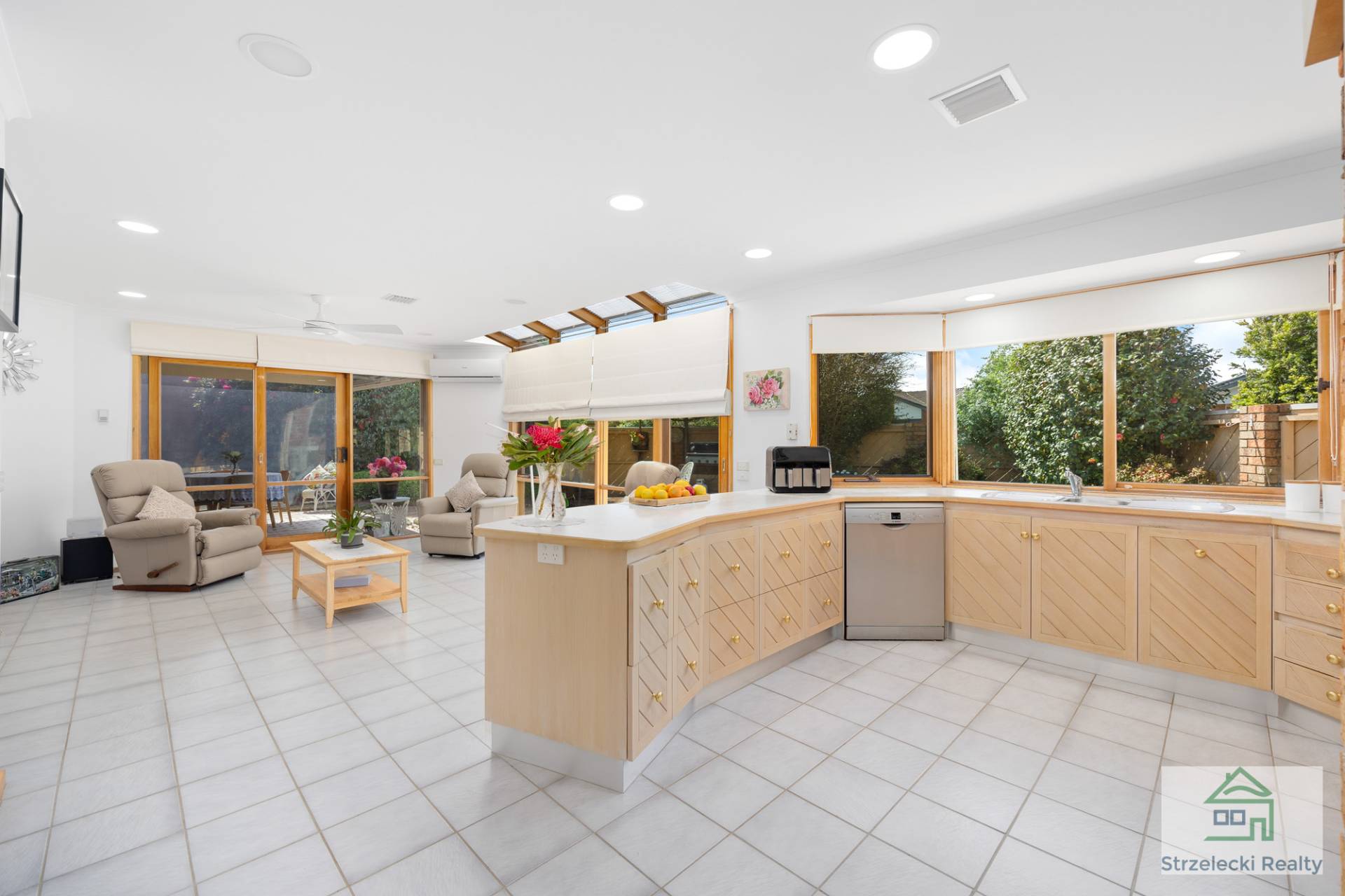 Featuring three bedrooms and two bathrooms, the master suite comes complete with his & hers BIR’s, ensuite with dual vanities & spa bath while the remaining bedrooms include BIR’s and are serviced by the central bathroom. There are two living areas, both equipped with air conditioners and North facing windows letting the sunlight stream in. The formal lounge has beautiful raked timber ceilings and an open fire place, being the perfect place to retreat to after dinner.