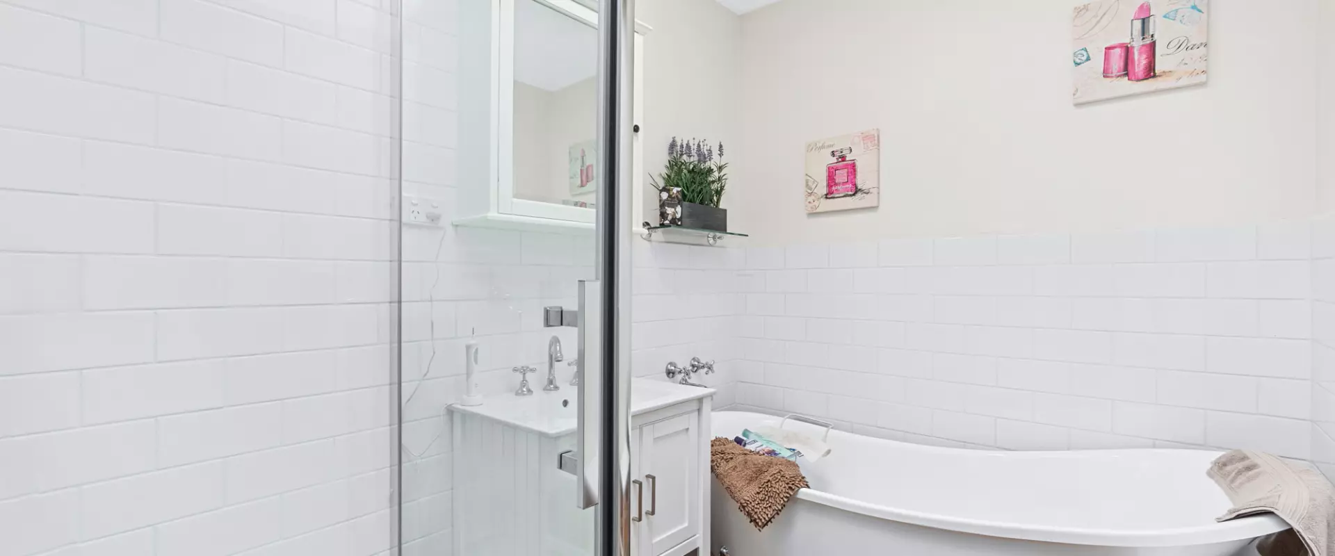A recently renovated bathroom features a beautiful claw foot bath, separate shower and loo.