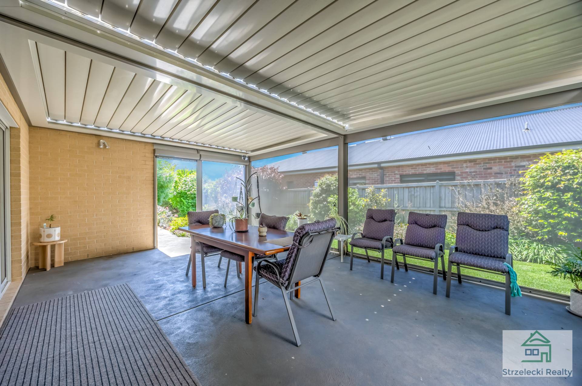 Stepping outside you’ll be impressed with a top of the line Louvretec Alfresco roof with adjustable louvres meaning you won’t have the weather dampen your party or have the sun or rain chase you back inside. With the additional café blinds this area is useable all year round to enjoy.